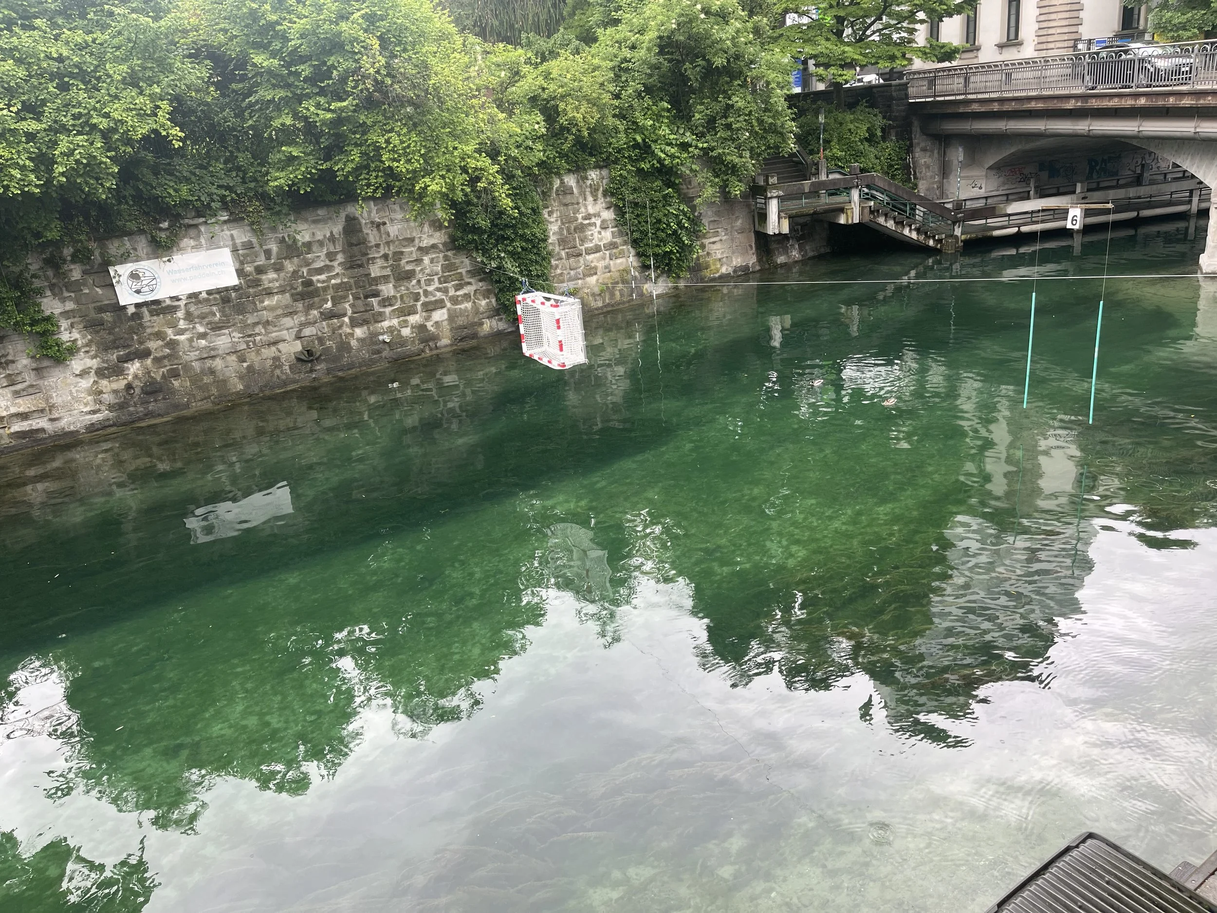 "Blijf hier niet te lang, het rivierwater kan snel stijgen. De rivierstand kun je hierboven, verderop, zien."Netten voor watersport, midden in de rivier