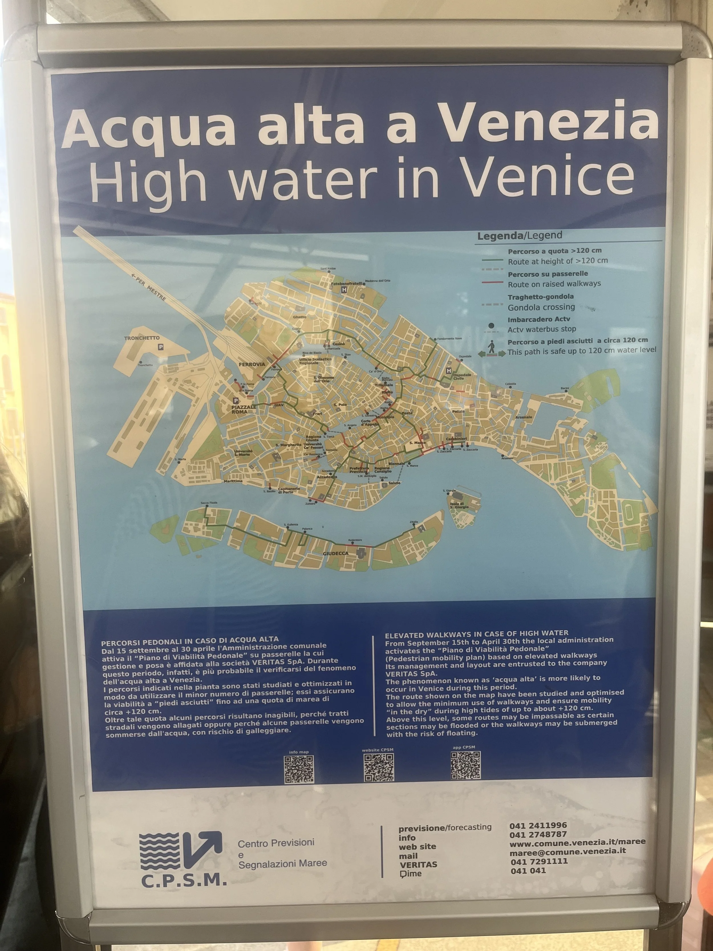 "Verhoogde wandelpaden in het geval van hoogwater: het 'pedestrian mobility plan' wordt jaarlijks van 15 sept - 30 april geactiveerd door de gemeente. Het fenomeen 'acqua alta' (hoogwater) kan in deze periode vaker voorkomen in Venetië. De routes op deze kaart zijn onderzocht en geoptimaliseerd voor het minimale gebruik van wandelpaden en om mobiliteit 'in het droge' gedurende hoogwater van tot ongeveer +120 cm te verzekeren. Boven dit peil zijn sommige routes mogelijk niet passeerbaar, aangezien sommige delen blank kunnen staan."
