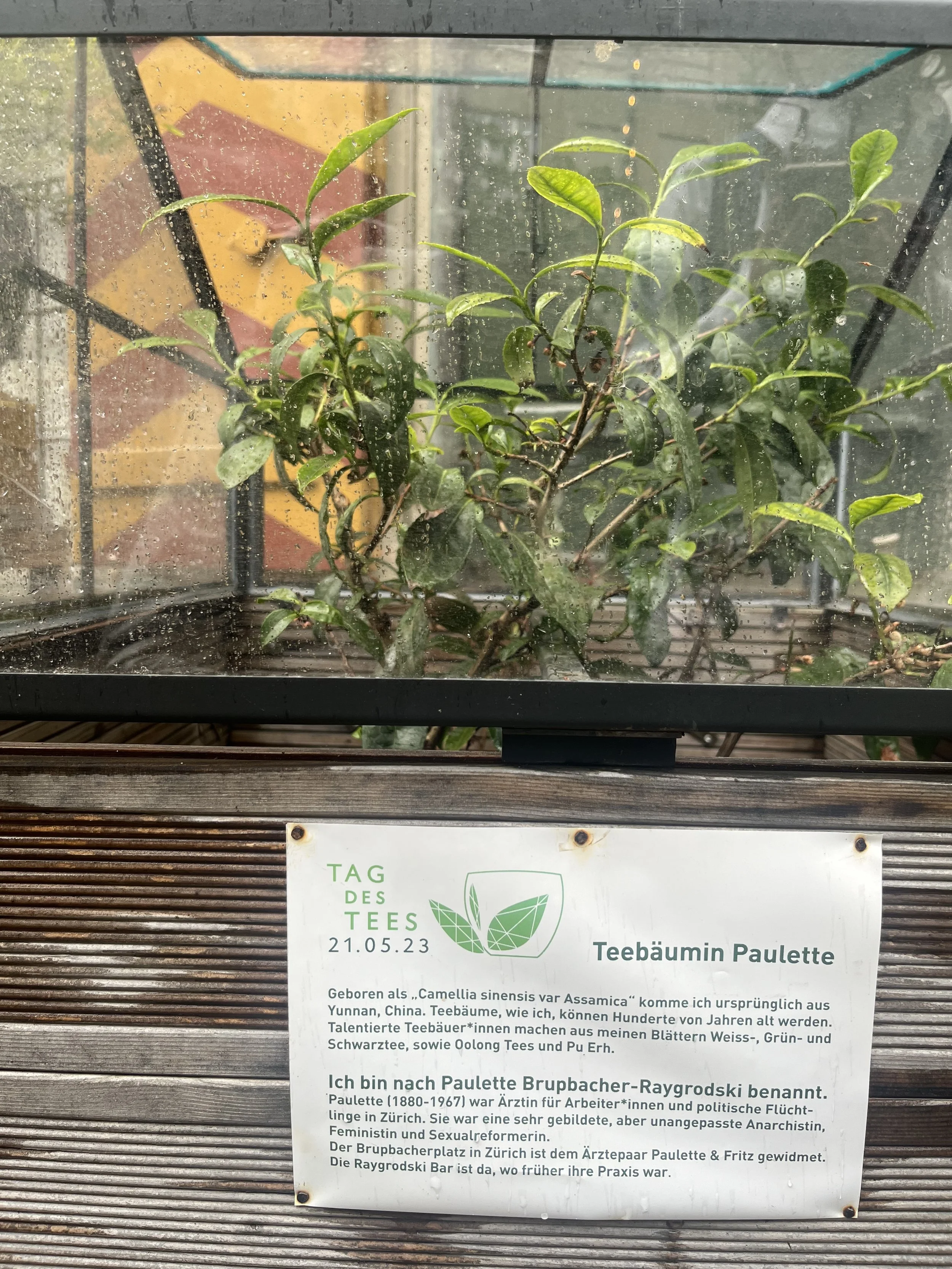 Theeboompje met naam en uitleg over haar herkomst. Gespot op het terras van een theehuis. I.h.k.v. het Nationale Theebomenfestival van 2023 – geeft waardering aan planten :)