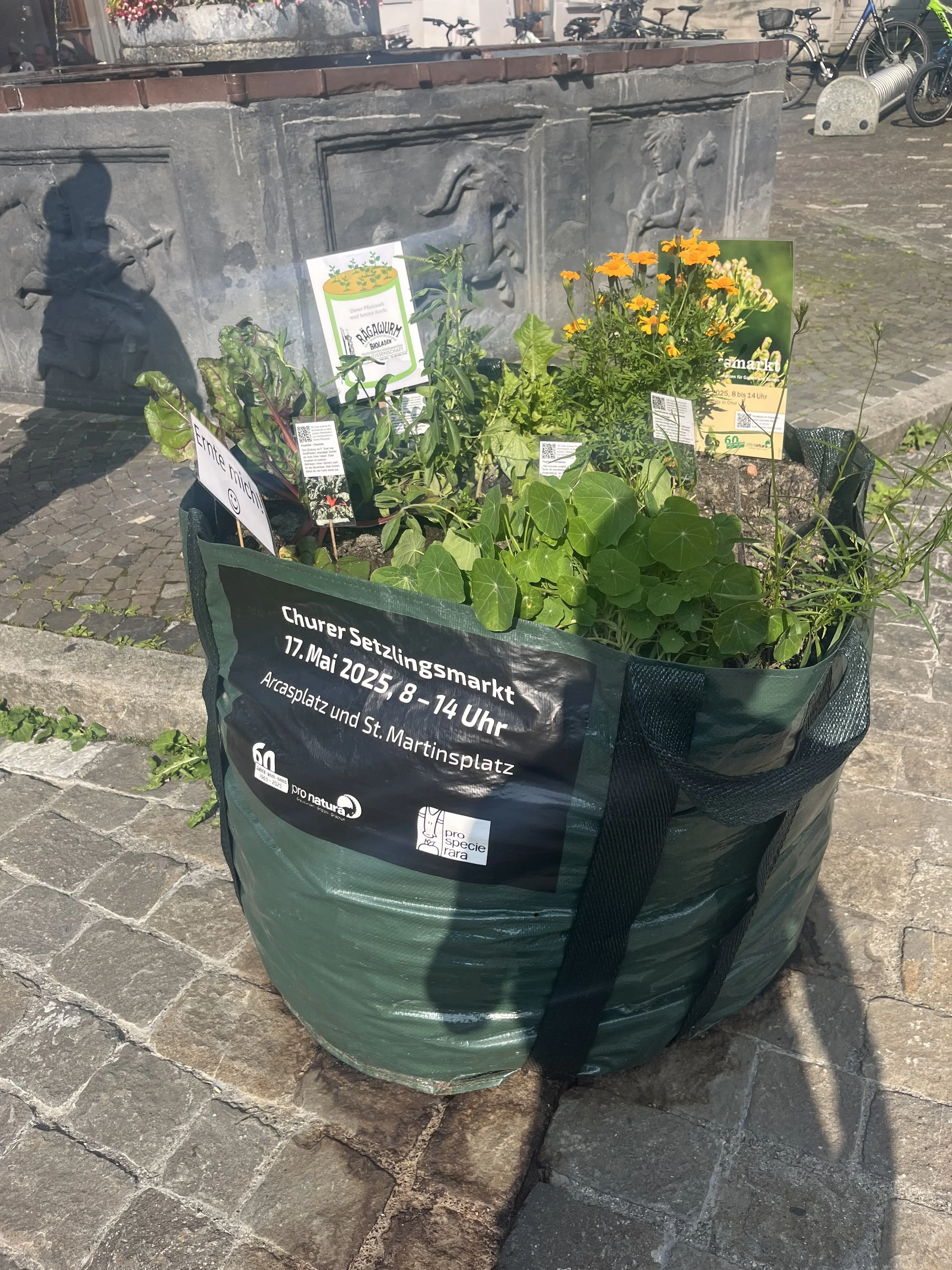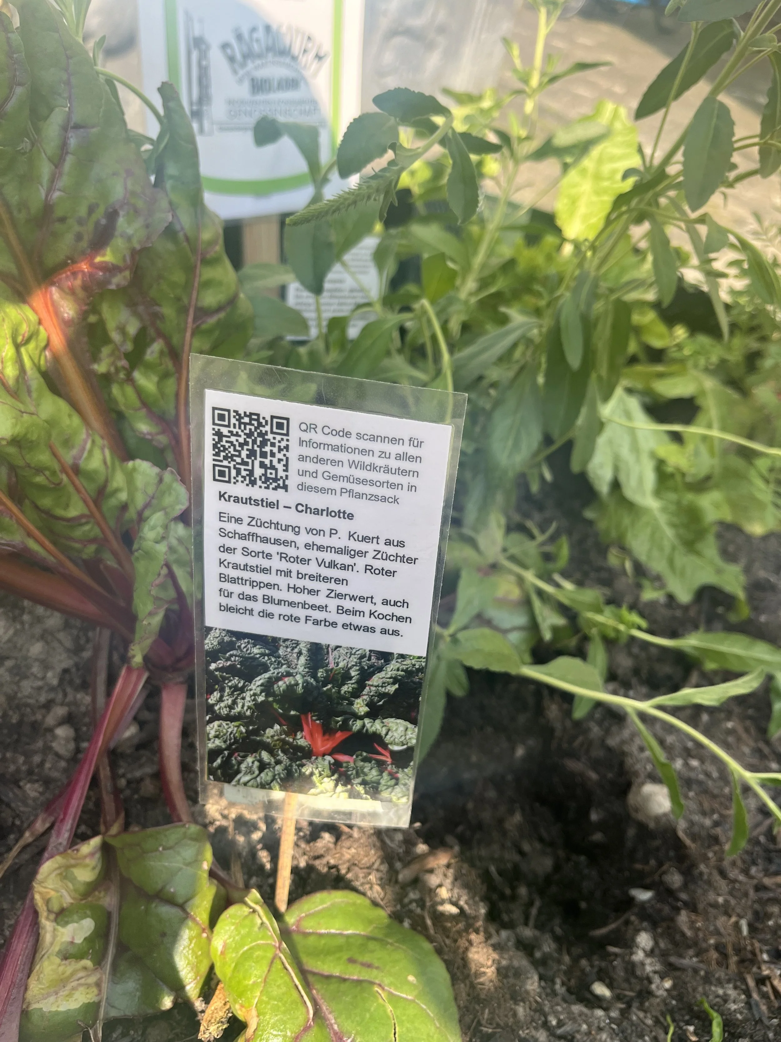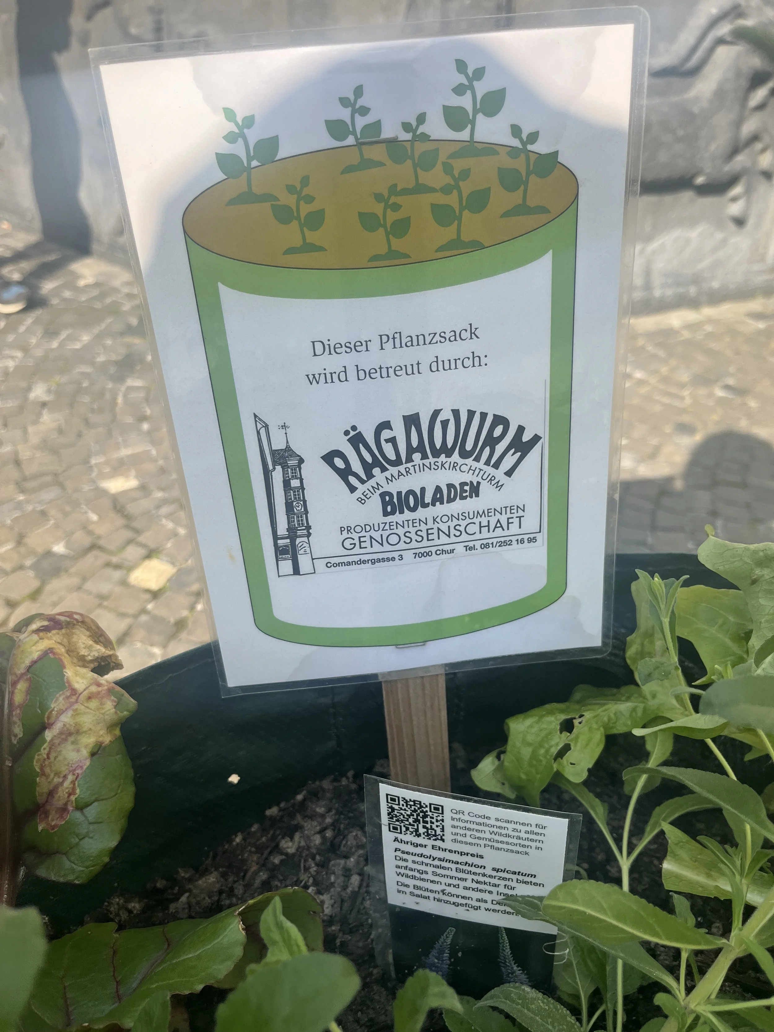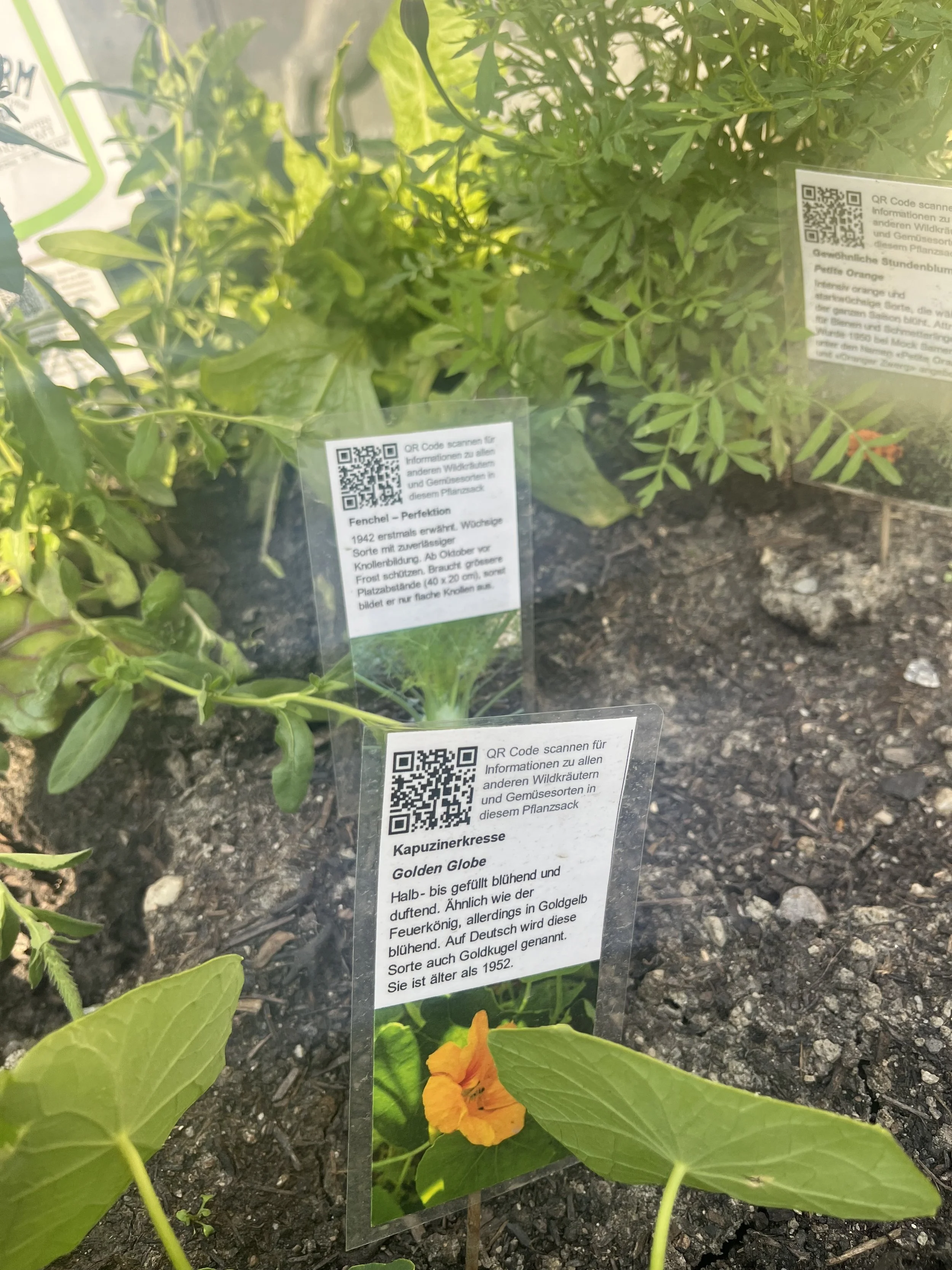 Compostzak met verschillende plantjes en QR-codes met verdere uitleg over de planten. Gesponsord door de lokale biowinkel.