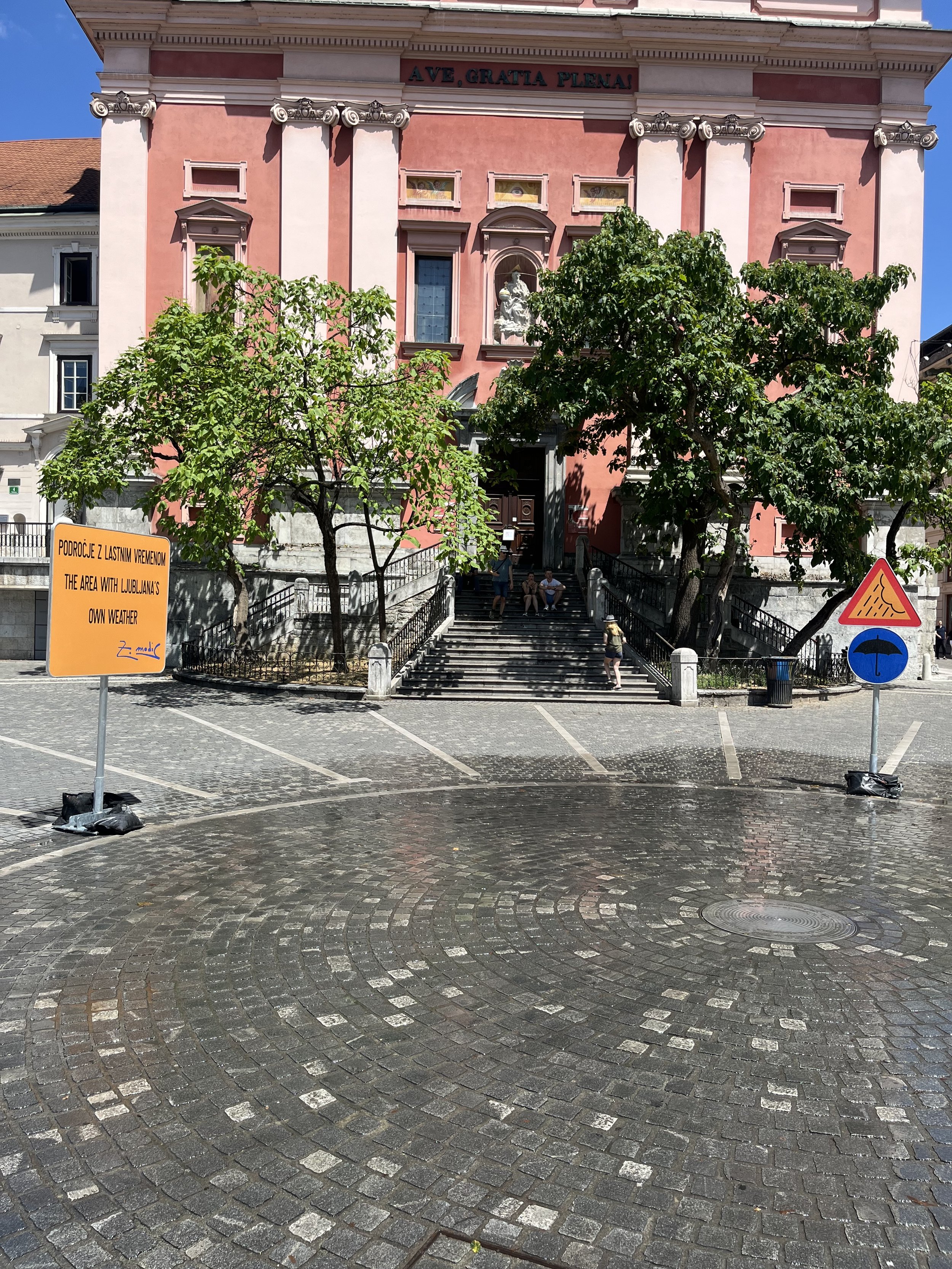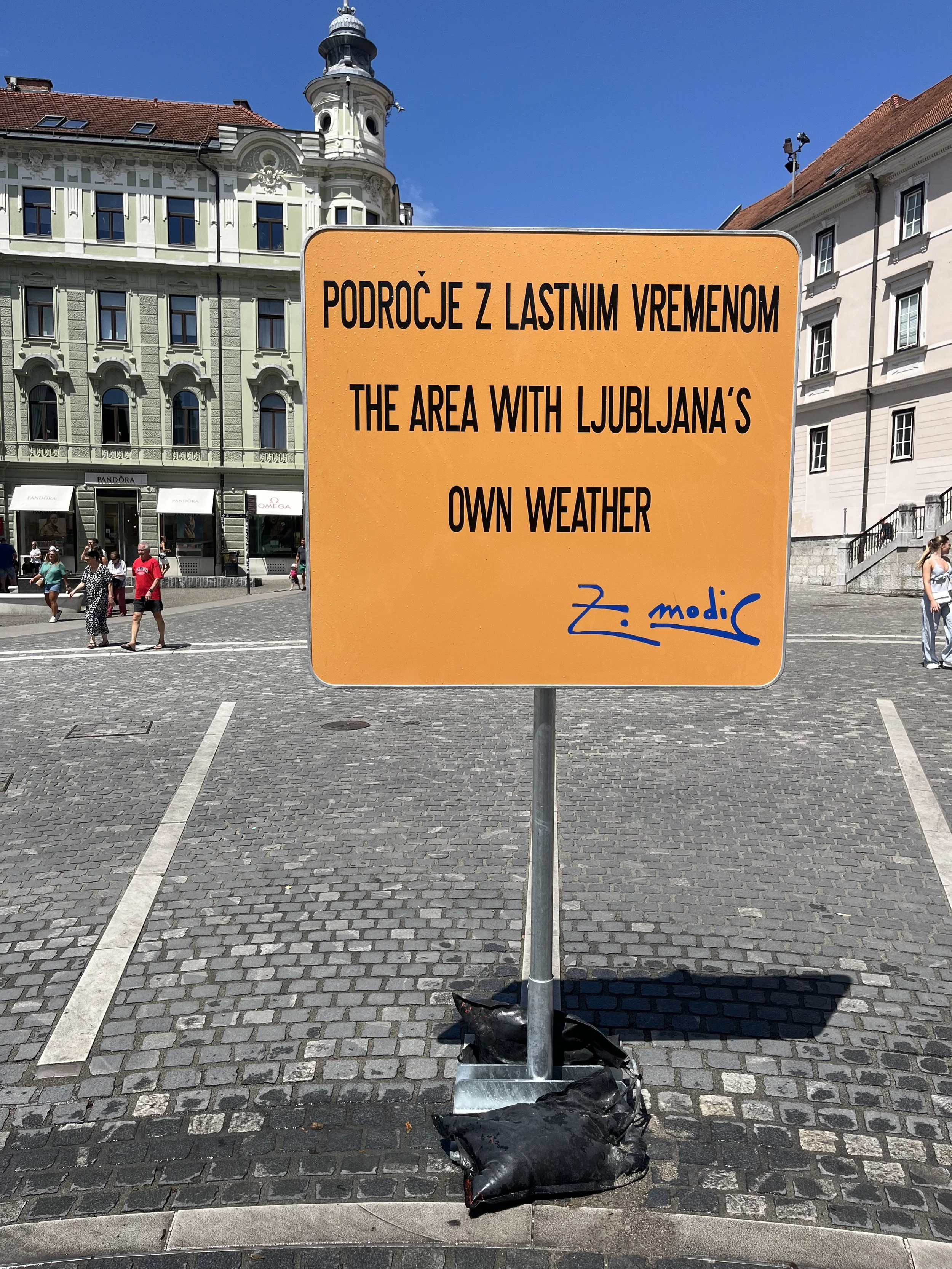'The area with Ljubljana's own weather' ('Področje lastnega vremena') is een interactief kunstwerk op het Plevice-plein. Het is gemaakt door de Sloveense kunstenaar Zmago Modić. Modić was in de eerste plaats schilder, maar werd ook bekend door het ophangen van kerstverlichting door de hele stad. Dit werk leidde in 2008 tot de creatie van dit kunstwerk, toen Modić de kerstverlichting inruilde voor zorgvuldig geplaatste sproeiers. Het werd vanaf 2015 een vaste seizoensinstallatie en is elke zomer te bezoeken. De gemeente sponsort dit initiatief. Sinds de binnenstad een autovrije zone is geworden, beschouwt de gemeente dit drukbezochte plein als één van de hitte-hotspots in de stad.