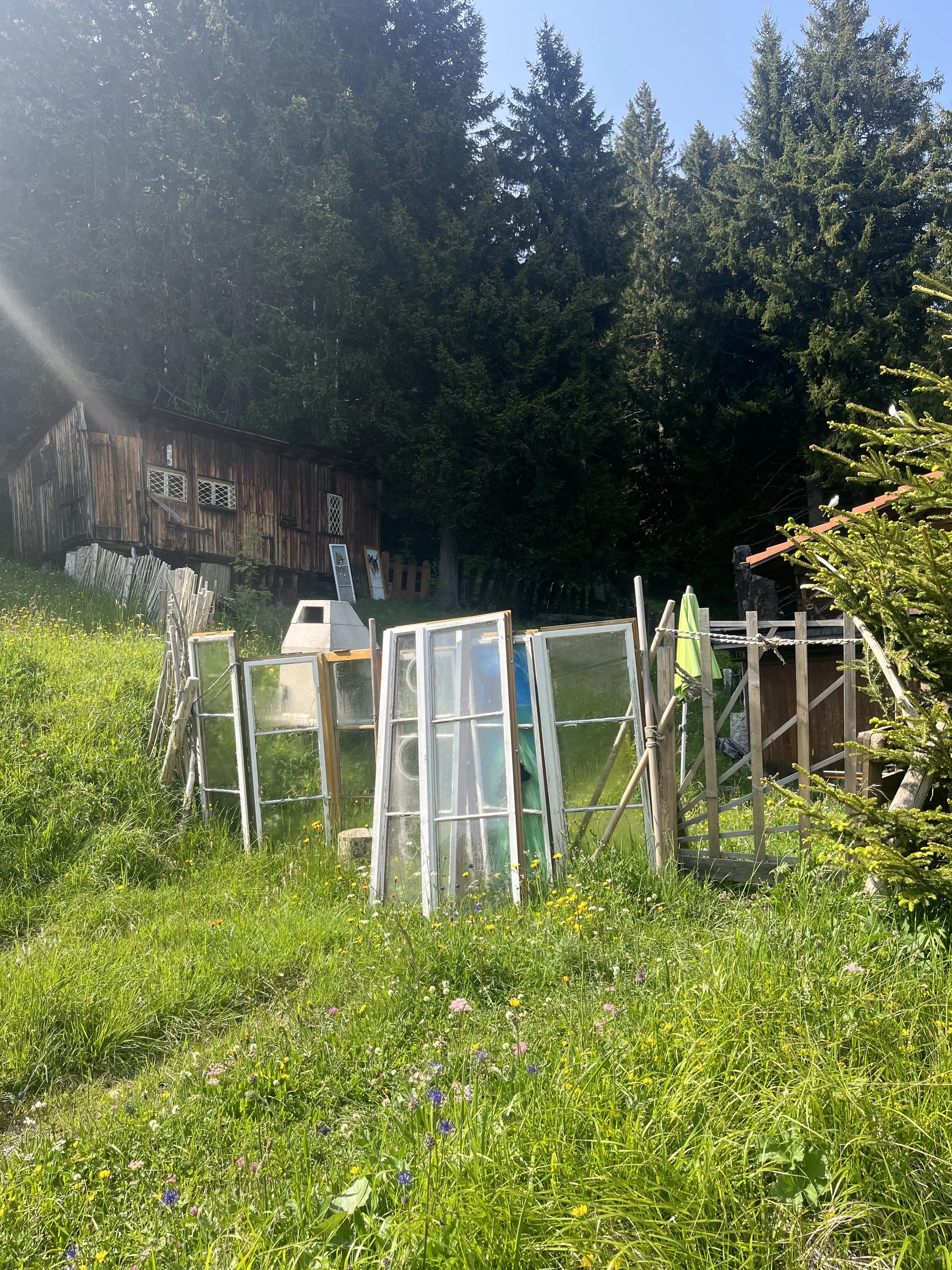Schutting bestaande uit oude ramen en deuren, lekker circulair.