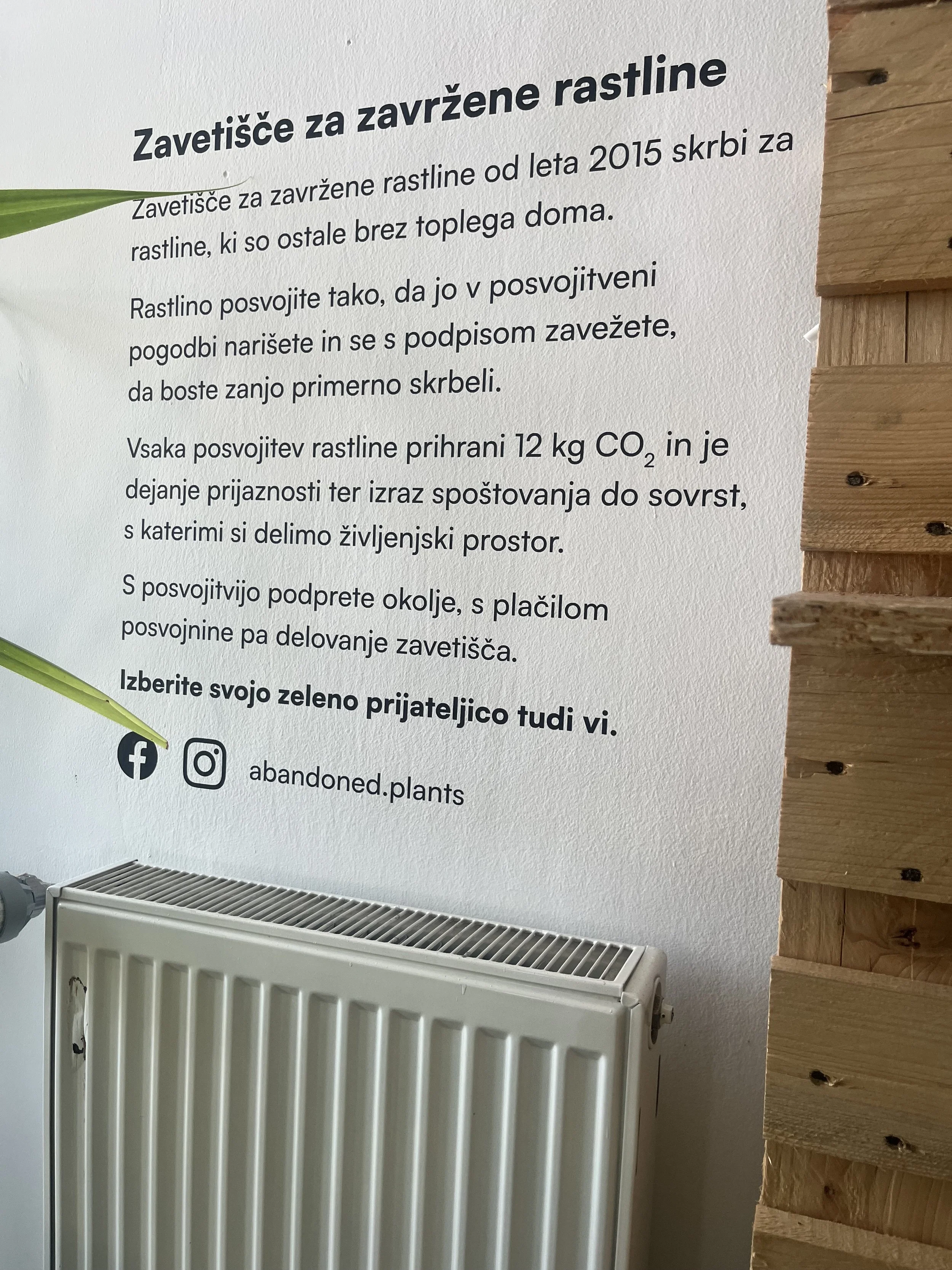 Vertaling: "Sinds 2015 verzorgt het plantenasiel planten die geen warm thuis meer hebben. Adopteer een plant door een adoptiecontract te tekenen en een bijdrage te betalen. In het contract belooft u dat u goed voor de plant zult zorgen. Elke plant die we adopteren, bespaart 12 kg CO2 en is een vriendelijke daad en een uiting van respect voor de soorten met wie we onze leefruimte delen. Door te adopteren steunt u het milieu en door het betalen van de adoptiebijdrage steunt u de instandhouding van het asiel. Kies ook je eigen groene vriend."